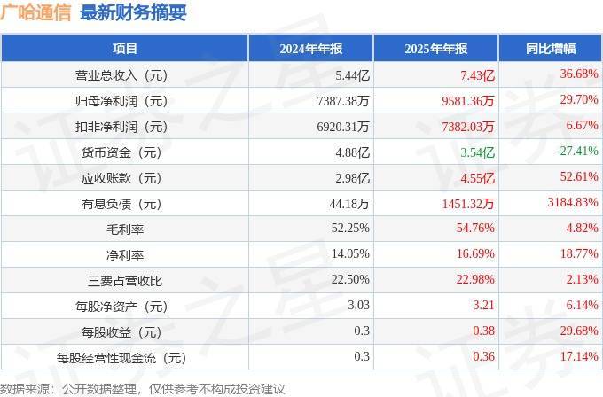 据证券之星公开数据整理,近期广哈通讯(300711)发布2025年年报。收尾本评释注解期末,公司营业总收入7.43亿元,同比高潮36.68%,归母净利润9581.36万元,同比高潮29.7%。按单季度数据看,第四季度营业总收入4.11亿元,同比高潮32.73%,第四季度归母净利润6037.72万元,同比高潮14.1%。本评释注解期广哈通讯应收账款高潮,应收账款同比增幅达52.61%。