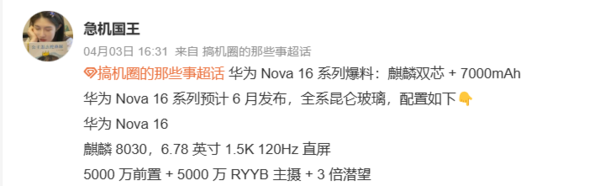 电板与充电方面,华为nova 16系列全系或内置7000mAh硅碳负极大电板,并标配100W有线超等快充,而Pro及Pro Max版块可能独享50W无线快充功能。