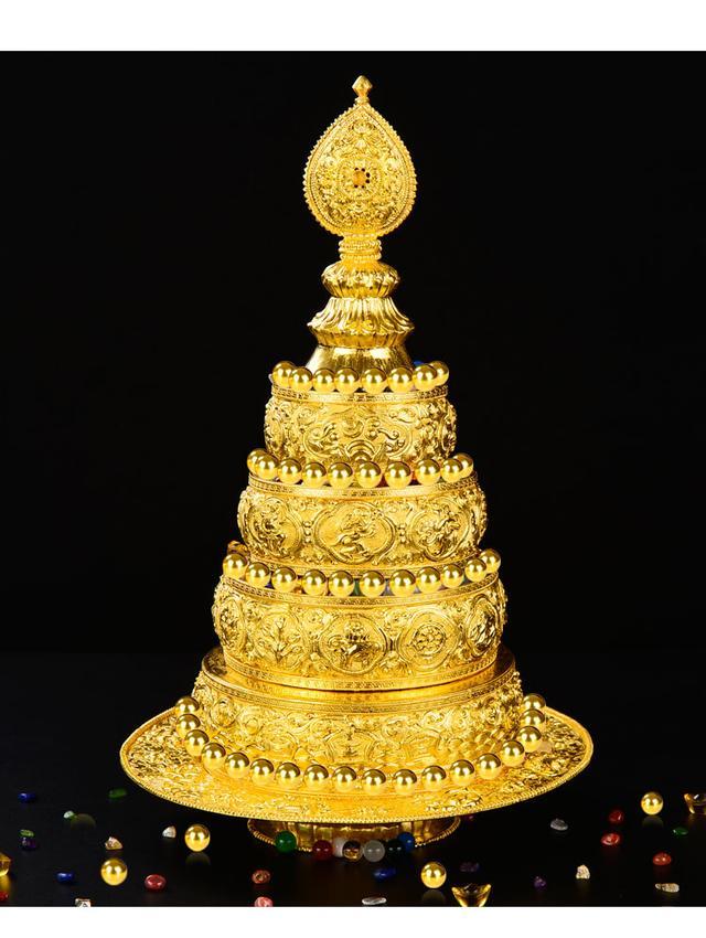 浮图高约2米,使用200斤黄金打造,工艺精粹,塔身各层嵌入绿松石、青金石等重视对峙。