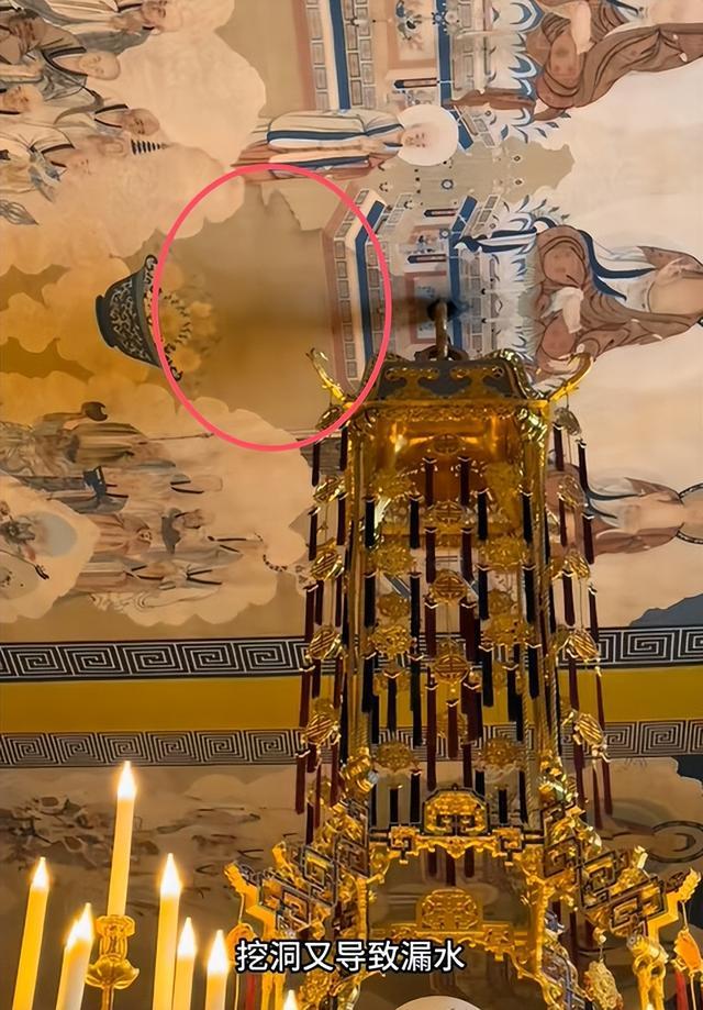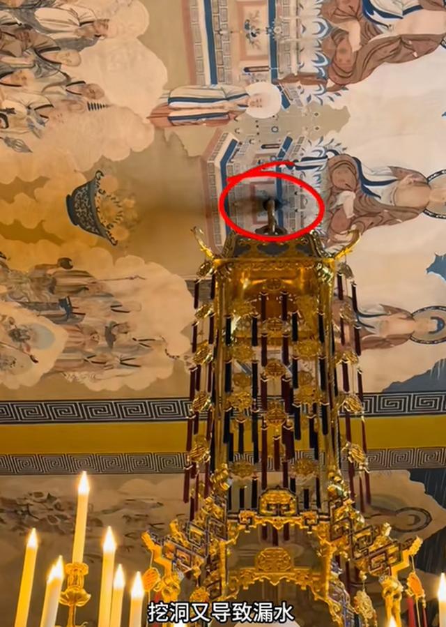 更离谱的是,为了吊挂吊灯,简直在如来佛莲花台的位置,径直防止地钻了孔。