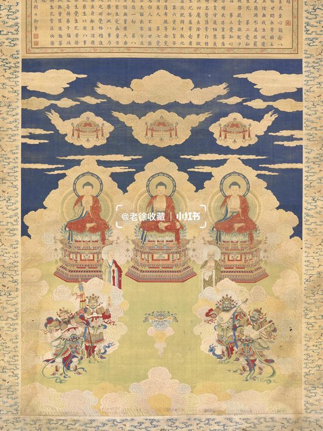 画面主体为三世佛,周围环绕十八罗汉、四大天王及祥云伎乐。