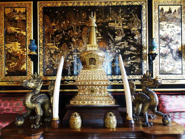 在中国馆中,能看到一尊景泰蓝熏炉完整遗弃于青铜鎏金佛塔前。